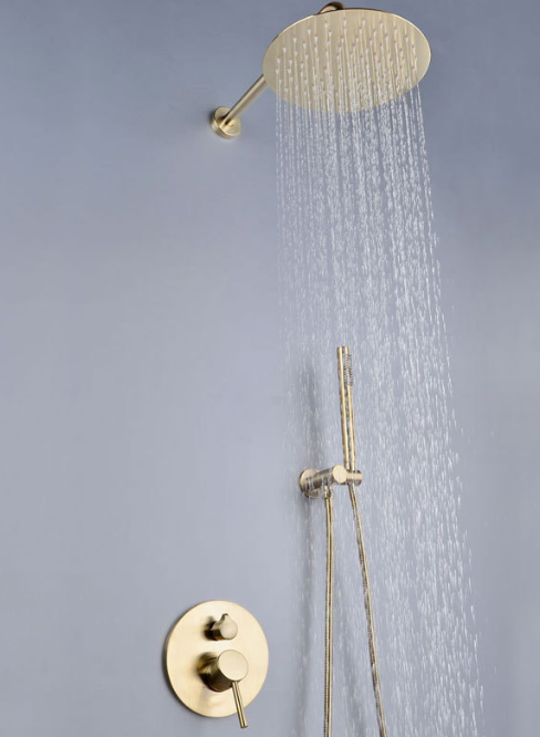 OEM ODM sanitaryware Brushed gold concealed bathroom showers embedded wall type hidden shower All copper brushed gold hot and cold water faucet LA1056 is installed on the bathtub mixer